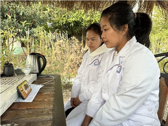 (云南省澜沧县岩因村钟丽萍医生与同事在线上观看新冠防治培训课)