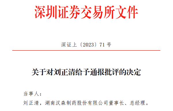 因短线交易公司股票,湖南汉森制药股份有限公司(“汉森制药”)董事长、总经理刘正清被深交所通报批评。