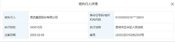 天眼查App显示,近日,昆药集团股份有限公司(“昆药集团”)新增一则被执行人信息,执行标的34万余元,执行法院为昆明市五华区人民法院。