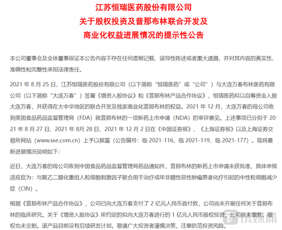 2021年8月25日,恒瑞医药与大连万春签署《增资入股协议》和《普那布林产品合作协议》,拟以自筹资金1亿元认购大连万春的股份,同时获得在大中华地区的联合开发及独家商业化普那布林的权益。针对普那布林的商业化,恒瑞医药一次性支付大连万春首付款2亿元,并在达到相应的研发里程碑和商业化里程碑时向大连万春支付总额不超过11亿元。