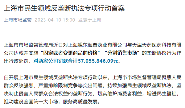 上海市市场监督管理局近日对上海旭东海普药业有限公司与天津天药医药科技有限公司达成并实施“固定或者变更商品的价格”“分割销售市场”的垄断协议行为作出行政处罚,对两家公司罚款合计57055846.09元。