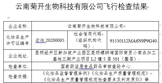 近期,国家药监局组织对云南菊开生物科技有限公司(以下简称“菊开生物”)进行了飞行检查。经查,发现菊开生物违反了《化妆品监督管理条例》《化妆品生产质量管理规范》等有关规定。该企业已对存在的问题予以确认。
