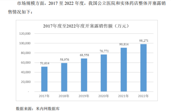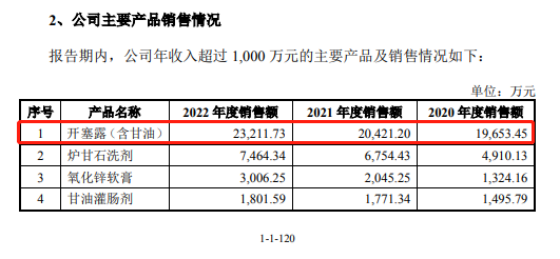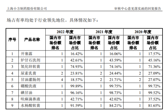 16.42%。由此推算,2020年至2022年,小方制药开塞露销售额约为1.348亿元、1.458亿元和1.614亿元。但招股书又披露,上述年度,小方制药开塞露销售额1.97亿元、2.04亿元和2.31亿元,这与对应的市场份额并不一致,小方制药并未解释上述差异的原因。