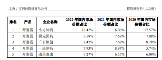 此外,小方制药招股书披露还存在自相矛盾之外。公司引用米内网数据显示,2020年至2022年,国内开塞露市场规模约7.677亿元、9.08亿元和9.83亿元。小方制药市场份额分别为17.57%、16.06%和