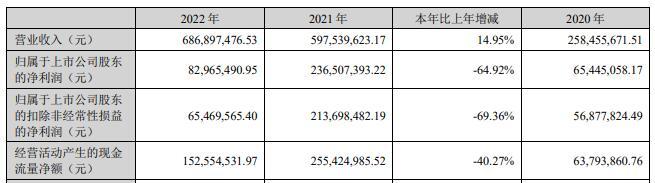 易瑞生物2022年年报显示,2022年,公司营业收入为6.87亿元,同比增长14.95%;归属于上市公司股东的净利润为8296.55万元,同比减少64.92%;归属于上市公司股东的扣除非经常性损益的净利润为6546.96万元,同比减少69.36%;经营活动产生的现金流量净额为1.53亿元,同比减少40.27%。