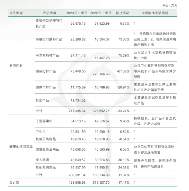 从具体经营业务来看,稳健医疗主营的医用耗材业务中,“感染防护产品”和“健康个护产品”两类营收下滑幅度最为明显,分别同比下降67.38%和29.91%。公司解释称主要系公共卫生事件得到有效控制,感染防护产品市场需求量减少以及手卫生等公共卫生事件相关产品销量下降所致。