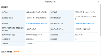 据天眼查显示,香雪制药新增一则股权冻结信息,股权被执行企业为广州香岚健康产业有限公司,冻结股权数额1000万人民币,冻结期限自2023年8月11日至2026年8月10日,执行法院为横琴粤澳深度合作区人民法院。