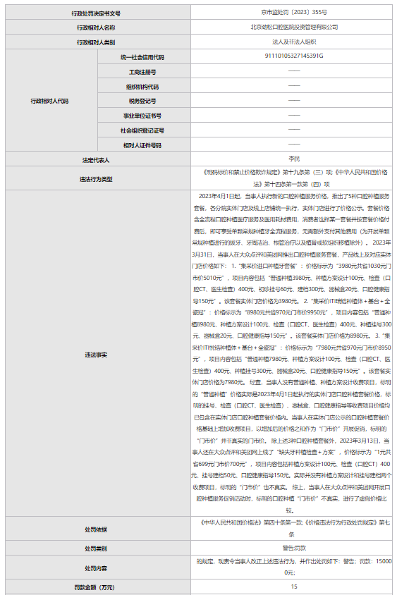 根据处罚信息,2023年4月20日起,北京佳美医院管理集团股份有限公司执行新的口腔种植服务价格,推出了6种口腔种植服务套餐,旗下30家直营门店统一执行并进行了价格公示。套餐价格含全流程口腔种植医疗服务及医用耗材费用,消费者选择某一套餐并按套餐价格付费后,即可享受单颗常规种植牙全流程服务,无需额外支付其他费用(为开展单颗常规种植进行的拔牙、牙周洁治、根管治疗以及植骨或软组织移植除外)。