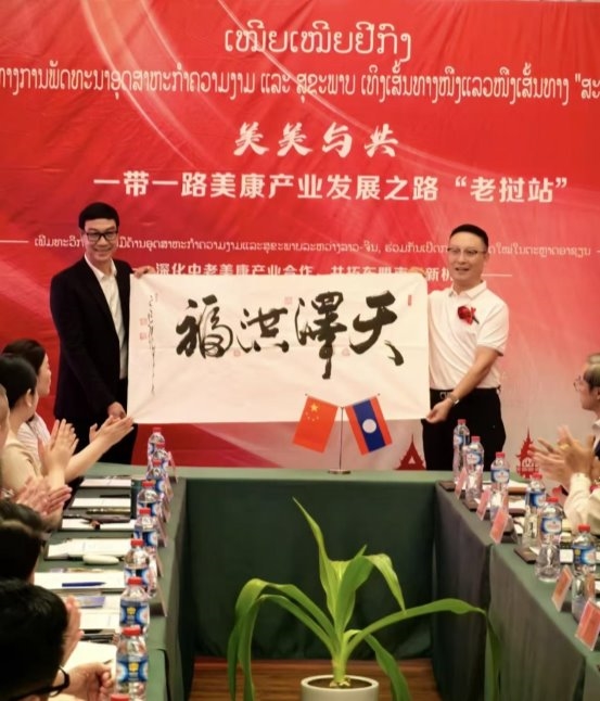 此次组团出海,正是希望与老挝占巴塞省在美容、美妆、健康、养生、文旅、康养、养老、中医及生物医药等多个细分领域探索新的合作机遇,实现资源共享、优势互补。并代表考察团向老挝占巴塞省文旅厅赠送了由深圳美促会副会长单位深圳诗碧曼科技集团定制的一带一路(美康产业)国礼礼盒和深圳市美促会专家学术委员会会长、中国著名量子科学家、中国长安书画院荣誉院长张铁民老师题写的书法作品:"天泽洪福",作为赠礼代表中老友谊渊源流长。