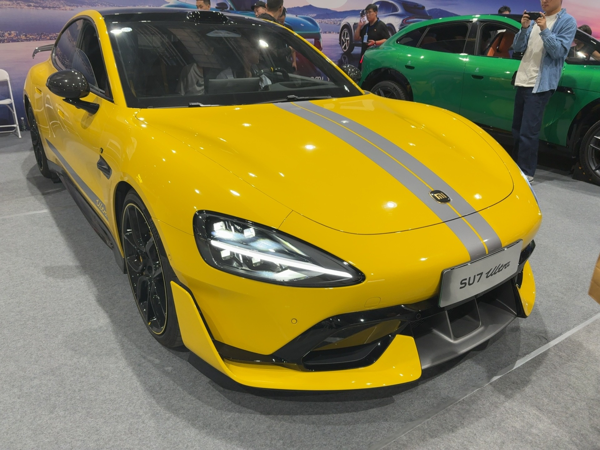 小米 SU7 Ultra:作为纯电性能轿跑的 “天花板”,其采用亮黄色车身搭配灰色竞速条纹,外观极具攻击性。碳纤维套件、大尺寸运动轮毂与夸张的空气动力学设计,让其在展会中赚足眼球,现场观众纷纷围绕车辆,对其 “超跑级性能” 充满好奇,不少性能车爱好者表示 “这就是电动时代的性能图腾”。