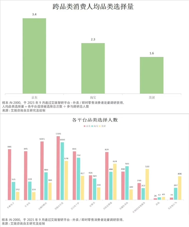 另外一组调研数据揭示了消费习惯重塑的本质,对比京东、淘宝与美团上进行跨品类消费倾向的行为,平均一位外卖消费者会留在平台上选择的其他商品种类分别为3.4个、2.4个和1.8个,京东和淘宝都以品类优势呈现出更强的承接优势。从数据来看,京东除了在3C、家电、数码等传统优势品类承托表现优秀外,在超市百货、个护、医药健康等品类上的承接也稳稳领先,这得益于平台长期在品质保障、品类丰富度、物流效率及售后服务上的积累。