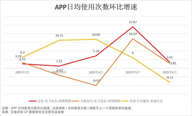 数据显示,今年4月,美团APP日均使用次数环比增速为16.66%,处于领先位置,紧接着,关键转变在5月份发生,京东以23.87%的高增速领跑全行业,淘宝紧跟其后环比增长16.97%,而美团增速滑落至6%。结果显而易见,2025年5月,外卖补贴带动市场重新洗牌。