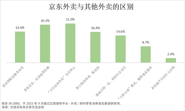 调研中,京东显然具有明显优势,提到京东外卖与其他外卖的区别,21%的用户认为是“主打品质外卖,安全放心”, 20.3%的用户觉得“背靠京东电商平台,品质保障,值得信赖”,16.6%认为“有更好的配送服务态度”,这些用户眼中的差异,已经转化为真实的选择偏好,也意味着京东外卖以“信任”为核心的品质化路线,不仅让其在市场中站稳了脚跟,也为行业树立了“价值竞争”的标杆。
