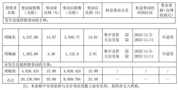 晶华新材昨晚发布关于控股股东、实际控制人及其一致行动人权益变动触及1%刻度的提示性公告。公司于2025年11月11日收到控股股东、实际控制人周晓东、周晓南,及其一致行动人周锦涵出具的《关于权益变动触及1%刻度的告知函》,获悉自2025年11月3日至2025年11月11日期间,周晓东及周锦涵通过集中竞价、大宗交易方式减持公司股份;本次权益变动导致控股股东、实际控制人及其一致行动人合计持有公司股份比例由34.99997%变为33.49%,权益变动触及1%刻度。