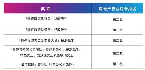 6月23日,国际知名金融杂志《机构投资者》(Institutional Investor)颁布2022年度“亚洲最佳企业管理团队”榜单,旭辉控股凭借在企业治理、投资者关系管理以及ESG等方面的卓越表现,荣膺“最受尊崇公司”称号,并荣获“最佳ESG”、“最佳CEO”、“最佳CFO”、“最佳投资者关系团队”、“最佳投资者关系专业人员”等多项大奖。