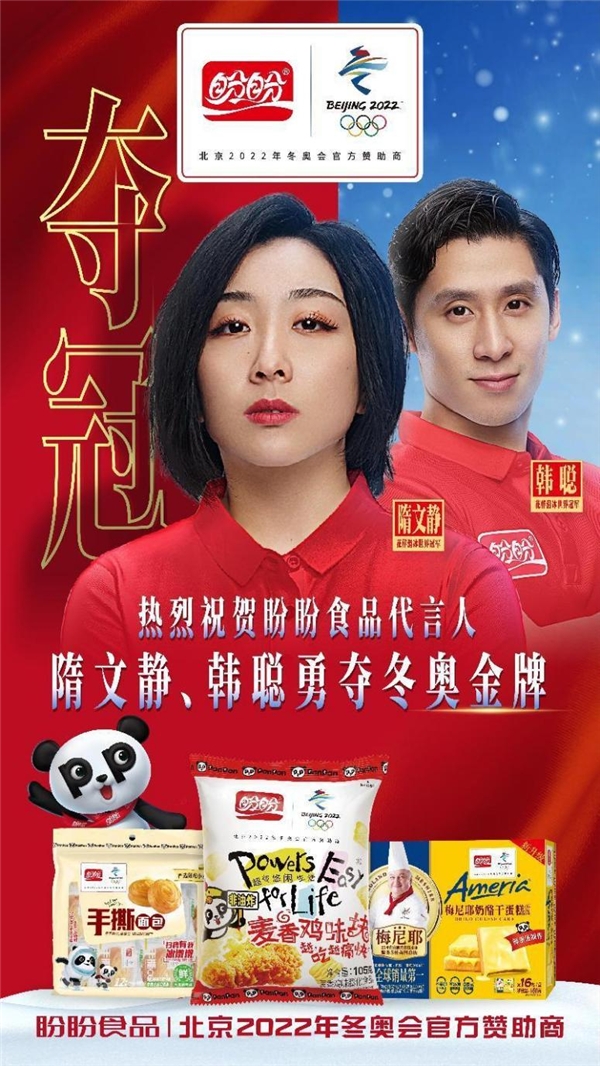 盼盼食品深信体育竞技的绝对公平,更钦佩在体育精神的熏陶下培养出的卓越品质。为了推广国家体育,让冠军背后的故事被更多人熟知。2021年5月,盼盼食品邀请中国花滑小将隋文静、韩聪作为产品代言人,竞技场上葱桶组合默契十足,场下相互支持彼此鼓励,受到人们的的喜爱。今年2月,隋文静、韩聪组合也不负中国人民厚望,在冬奥会上以总分239.88分的成绩打破世界记录,拿下了在花样滑冰双人滑比赛的冠军,这也侧面肯定了盼盼食品在体育营销方面的眼光。