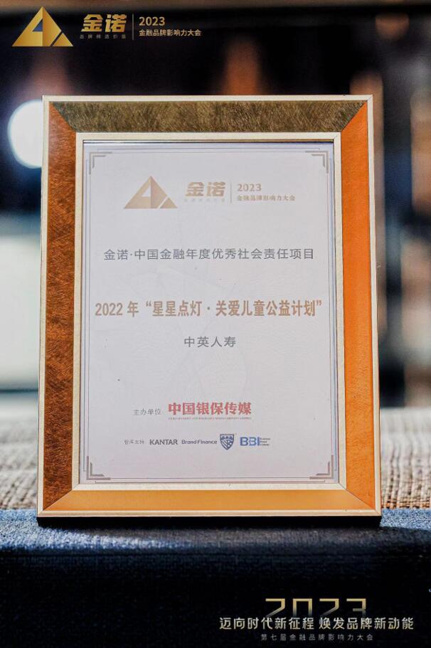 5月9日,《中国银行保险报》2023金诺·第七届中国金融品牌影响力传播案例入选名单揭晓。中英人寿凭借“星星点灯·关爱儿童公益计划”获评“金诺·中国金融年度优秀社会责任项目”大奖。
