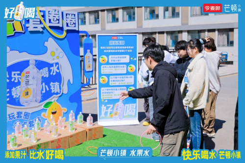 活动现场设置了飞盘挑战、趣味套圈等互动游戏,参与者通过完成打卡任务即可免费获得今麦郎芒顿小镇1L饮品。许多同学表示:“游戏设计轻松有趣,还能和朋友们一起分享大瓶装水果水芒顿小镇,体验感十足!”