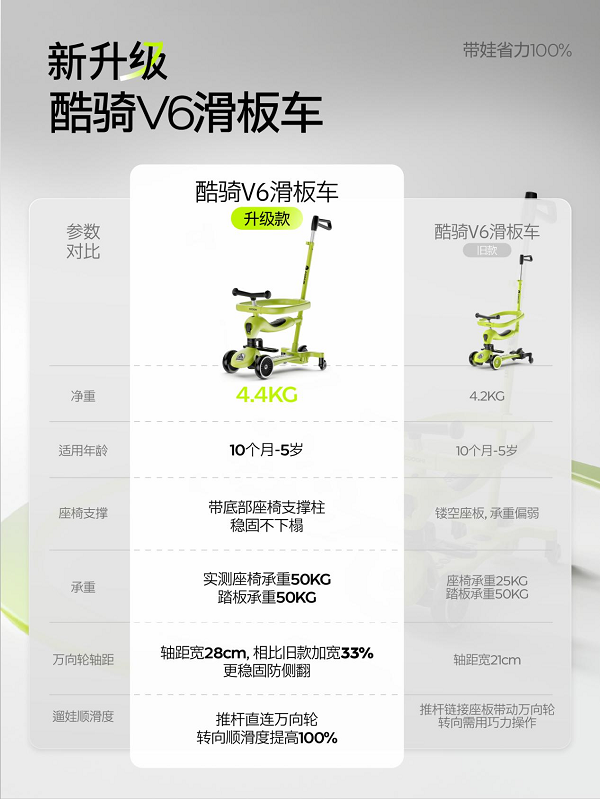 “万向轮太灵,不会推?”“座椅悬空,胖宝宝坐着不安全?”“推杆转向费劲?”……在翻看了海量用户评价后,酷骑团队将这些疑惑一一转化为产品升级的方向。新一代V6滑板车围绕“稳固性、承重性与操控性”进行了三大核心升级: