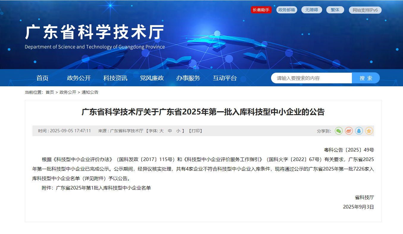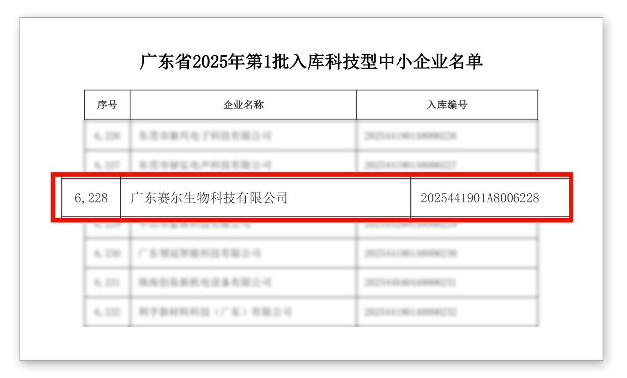近日,广东省科学技术厅公布了2025年第一批拟入库科技型中小企业名单。广东赛尔生物科技有限公司凭借突出的科技创新能力、稳健的研发体系和良好的发展潜力,成功入选名单。
