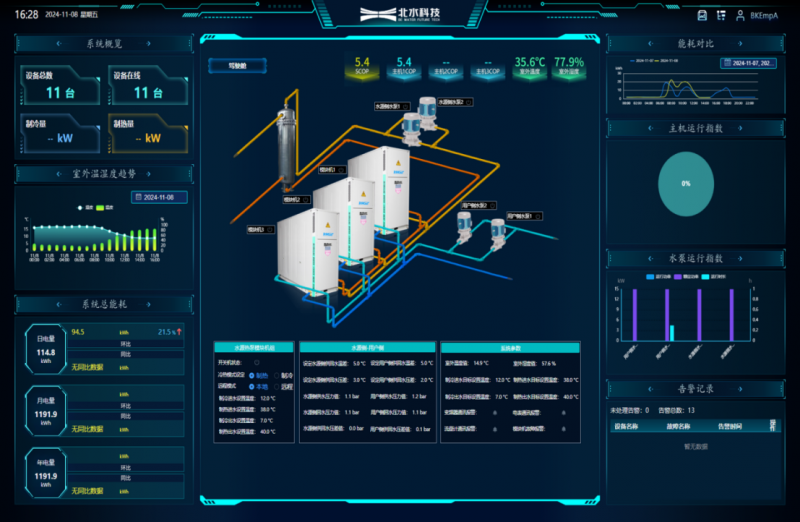 三河市燕郊西厂二期水源热泵系统改造项目是该技术的成功实践。系统集成大数据分析与人工智能算法,基于历史数据精准预测负荷变化,优化调度策略,实现能耗实时监控与动态调节,彻底解决了传统系统“夏季过冷、冬季过热、能耗过高、调节不便”的痛点。改造后,系统综合节能率达30%-40%,在显著提升用户舒适度的同时,大幅减少碳排放,为污水处理厂、工业园区等场景的能源管理提供了可复制、可推广的低碳模式。