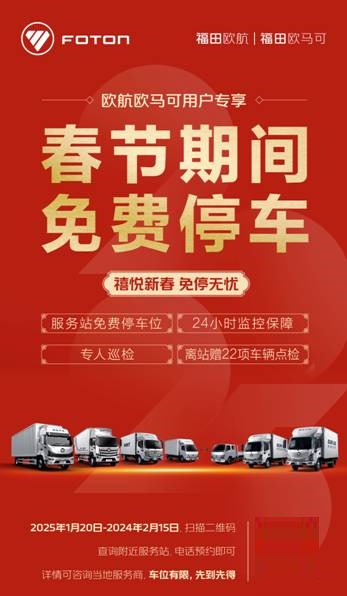 每逢春节长假,“停车难、停车贵、安全停车”成为卡友绕不开的话题。为缓解这一难题,欧航欧马可联合全国各大服务站推出“禧悦新春 免停无忧”活动,让卡友不受停车困扰,安心过大年。