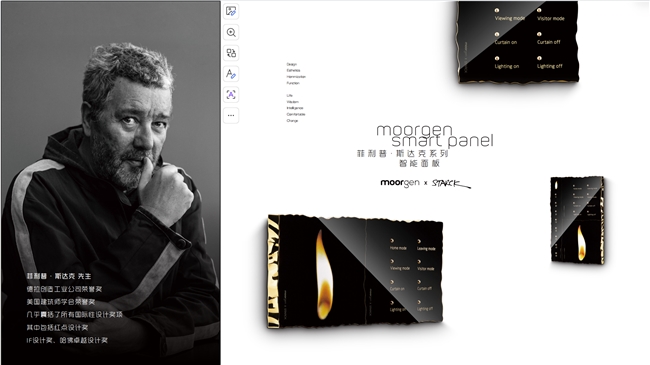 其中,全球设计巨匠菲利普·斯塔克将亲临现场,这位法国国宝级设计鬼才,全球工业设计标杆人物,同时也是法国奥运会金牌设计者,曾主持法国爱丽舍宫总统私宅改造。其作品超 10000 件,覆盖建筑、家居、产品等全领域,可谓是全球顶奢品牌争相合作的设计巨匠。此前,摩根与其联手共创的“火与石”系列智能面板,以“让日常用品成为承载情感与美学的艺术品”为核心,赋予开关面板独特的视觉与触觉质感,收获市场高度好评。
