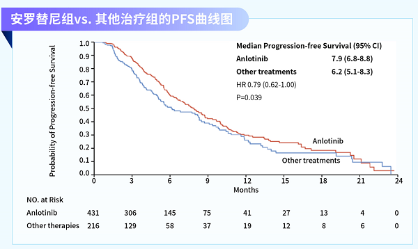 所有患者经过2:1倾向性评分匹配(PSM)后,安罗替尼单药或联合治疗组和其他治疗组分别有431例和216例患者,安罗替尼单药或联合治疗组的中位无进展生存期(PFS)显著长于其他治疗组(7.9个月 vs 6.2个月;HR0.79,95%CI:0.62-1.00;P=0.039)。客观缓解率(ORR)分别为9.5%和11.6%。