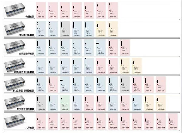 为适应多样化的临床修复场景,锋将车针提供涵盖圆锥形、倒锥形、梨形、鱼雷形等在内的近30种工作端形态,全系列型号总数近800个。此外,企业还推出了8种临床常用套装组合设计,可满足从常规修复到精细美学修复的多层次临床需求,为口腔医生提供一站式车针选配方案。