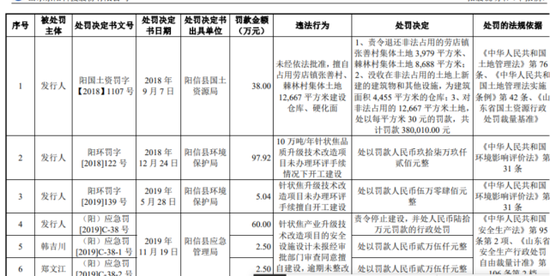 详细来看,2018年9月7日,阳信县国资资源局对京阳科技予以38万元罚款,公司违法行为是未经依法批准,擅自占用劳店镇张善村、棘林村集体土地12667平方米建设仓库、硬化面。