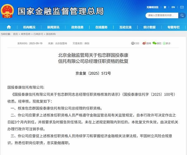 今日,北京金融监管局公布相关批复信息,核准包恋群国投泰康信托有限公司(简称“国投泰康信托”)总经理的任职资格。以下是相关批复正文: