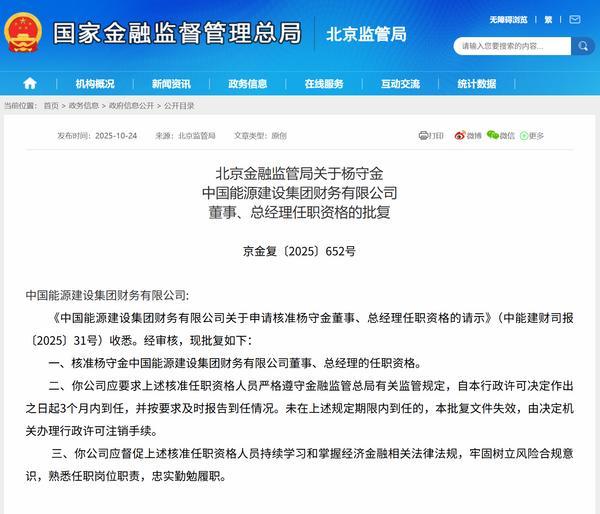日前,北京金融监管局公布相关批复,核准杨守金中国能源建设集团财务有限公司(简称“中国能源建设集团财务公司”)董事、总经理的任职资格。以下是相关批复正文: