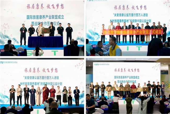会上进行了揭牌仪式、签约仪式、授牌仪式,并正式宣告成立“国际旅居康养产业联盟”,携手战略合作单位共同启动了走进乡村旅居康养基地的健康公益计划与“一带一路”企业健康出海计划。