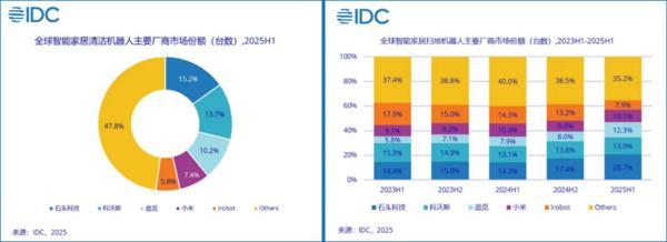 而就在IFA展开幕的前两天,9月3日国际数据公司IDC发布《全球智能家居清洁机器人设备市场季度跟踪报告,2025年第二季度》。报告显示,2025上半年,石头科技不仅以15.2%的份额领跑全球清洁机器人市场,更在核心的扫地机器人品类中拿下20.7%的市场份额,稳居全球第一。(注:IDC定义智能家居清洁机器人包含扫地机器人、泳池机器人、割草机器人、擦窗机器人、空气净化机器人)