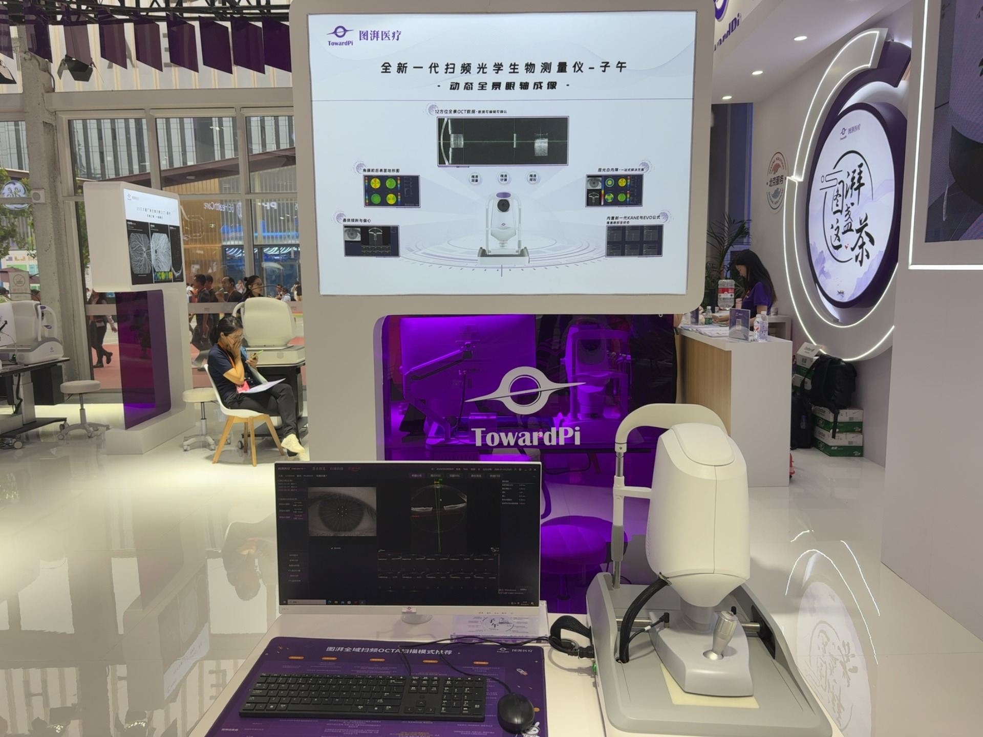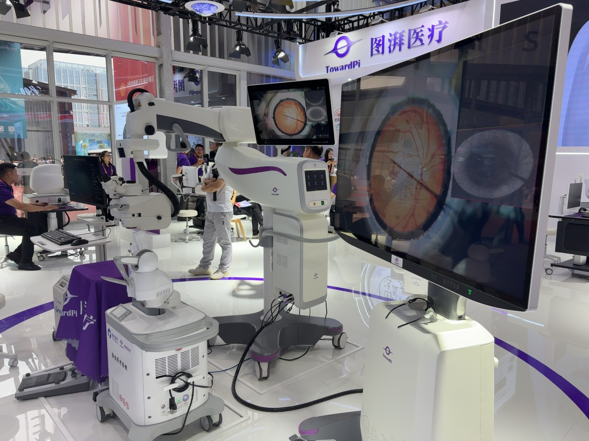 展区以紫色为主色调,搭配环形灯光与眼科医疗设备的沉浸式展示,形成 “技术呈现 — 临床价值 — 贸易对接” 的医疗服务贸易生态,吸引大量医疗行业专业观众、国际采购商驻足交流;