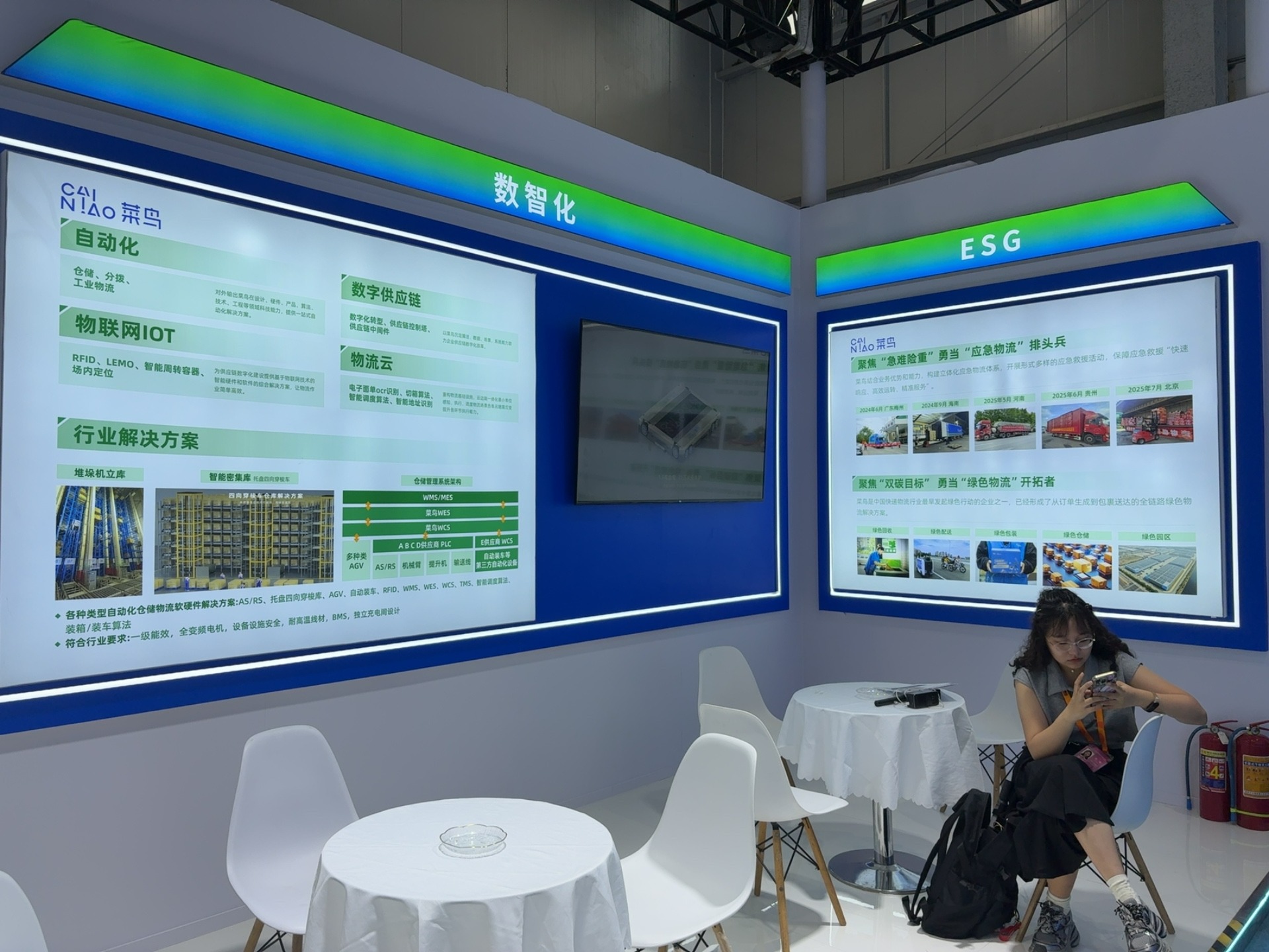 展台上,菜鸟呈现了覆盖 “全球化 — 数智化 —ESG” 的跨境物流服务矩阵: