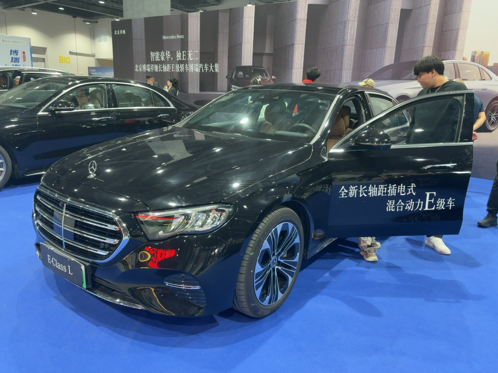 E 级长轴距插电混动:定位 “豪华混动行政座驾”,黑色车身搭配插电混动标识,兼顾性能与节能。其长轴距设计与插电混动系统的组合,满足了商务人士对 “绿色出行 + 舒适空间” 的需求,展台前咨询新能源政策与用车成本的消费者络绎不绝。