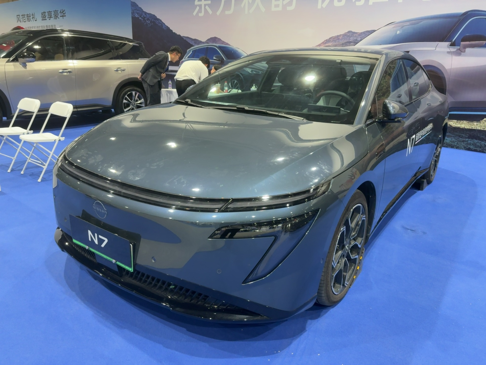 N7:英菲尼迪纯电阵营的 “科技先锋”,灰色车身搭配未来感设计,纯电属性凸显。作为品牌在新能源领域的创新力作,其 “极简设计 + 智能科技” 的组合引发热议,展台前咨询 “绿牌出行 + 豪华品质” 的消费者络绎不绝。