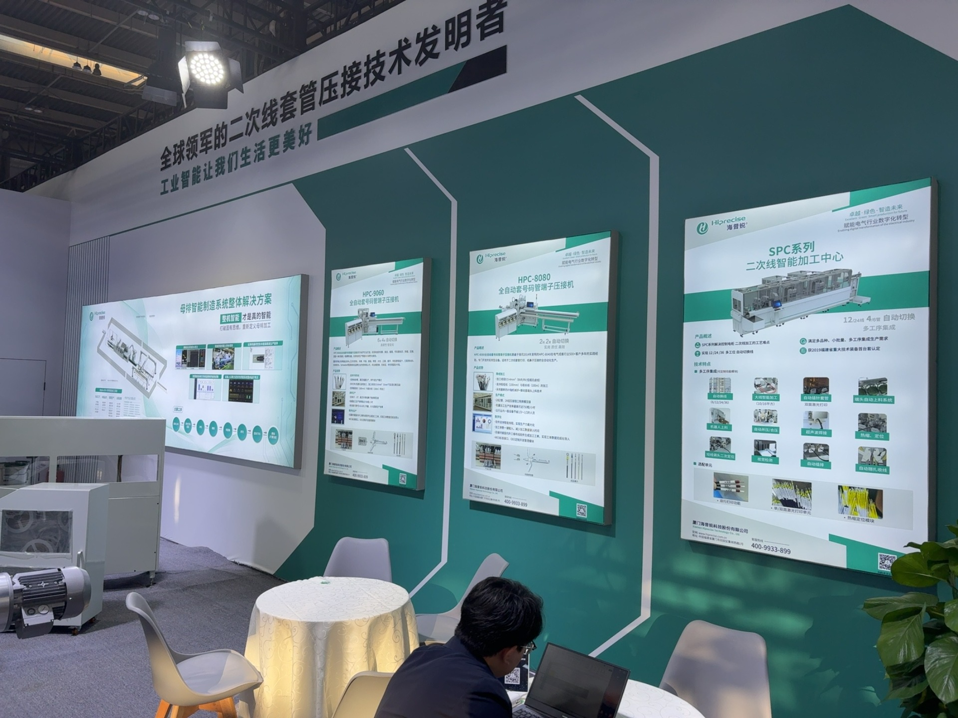 二次线套管压接设备展示其 “全球领先的二次线套管压接技术” 对应的自动化设备(如 HPC-8080 全自动导线套管压接机),可完成风电盘柜内导线的套管、压接、标识等工序的一体化作业,提升二次线加工的标准化与一致性。