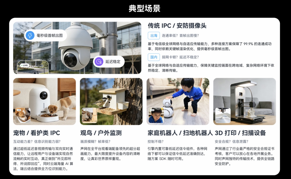 对于摄像头、扫地机器人、3D 打印机、宠物喂食器等设备,用户的期待早已不是“能远程看一眼”这么简单。他们希望:在海外也能秒速打开家里的监控;在弱网环境下扫地机依然听指挥;在宠物异常时第一时间收到提醒;在 3D 打印过程中实时掌控进度。这些期待的背后,是对实时交互能力与端云协同 AI 的双重考验。