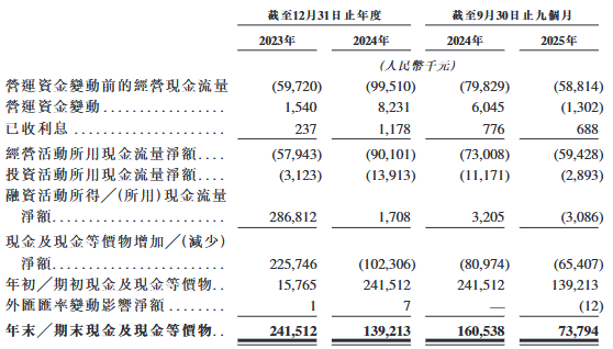 2023年、2024年以及截至2024年及2025年9月30日止九个月,公司营活动所用现金净额为人民币57.9百万元、人民币90.1百万元、人民币73.0百万元、人民币59.4百万元。