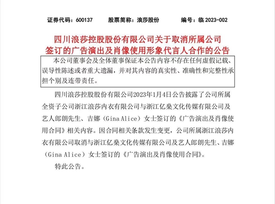 然而,1月5日,浪莎股份又发布一则取消所属公司签订的广告演出及肖像使用形象代言人合作的公告,公告称,取消系“因合同相关条款发生变更”。
