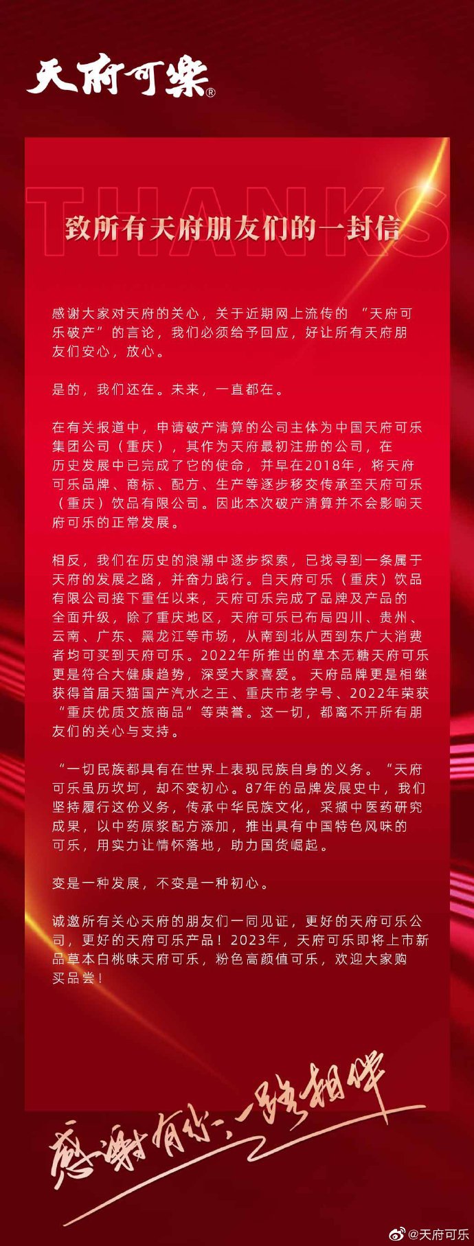 就在不少网友为之惋惜、纷纷囤货之时,4日,天府可乐在官方微博回应了破产传闻:“在有关报道中,申请破产清算的公司主体为中国天府可乐集团公司(重庆),其作为天府可乐最初注册的公司,在历史发展中已完成了它的使命,并早在2018年,将天府可乐品牌、商标、配方、生产等逐步移交传承至天府可乐(重庆)饮品有限公司,因此本次破产清算并不会影响天府可乐的正常发展。”