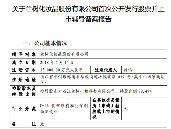 2022年12月22日,中信证券与兰树化妆品签署了辅导协议。2022年12月23日,兰树化妆品正式向中国证券监督管理委员会浙江监管局报送辅导备案申请材料,并于2023年1月6日获受理。根据辅导工作安排,此次辅导将持续到今年3月。