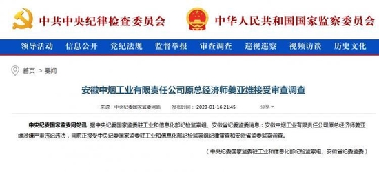 安徽中烟工业有限责任公司原总经济师姜亚维涉嫌严重违纪违法,目前正接受中央纪委国家监委驻工业和信息化部纪检监察组纪律审查和安徽省监委监察调查。