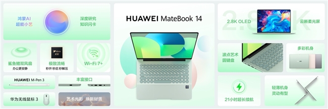 HUAWEI MateBook 14 鸿蒙版也在此次发布会上正式亮相。该产品部分配置搭载2.8K OLED云晰柔光屏,采用波点艺术键盘,为用户提供全新选择。采用金属一体化机身设计,机身薄至14.5mm、重约1.33kg,轻薄便携。软硬芯云协同及方舟引擎的加持,带来更流畅的整机体验。70Wh电池配合华为智能低功耗平台带来更持久的续航体验。