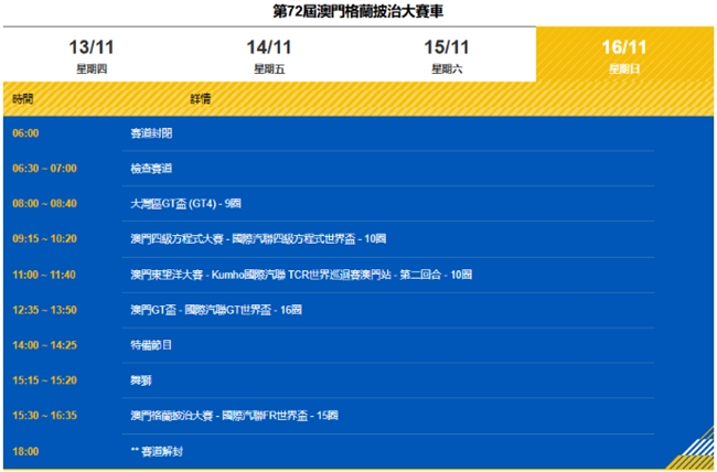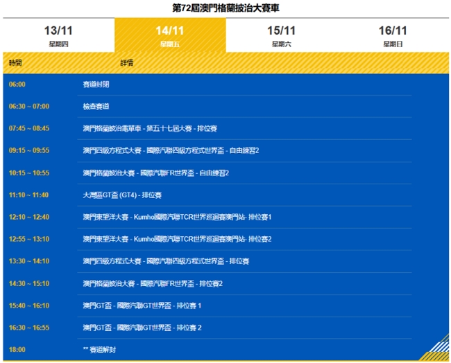 首日(13日),主要以各大赛事的自由练习赛为主,澳门格兰披治电单车(摩托车)、国际汽联四级方程式世界杯、国际汽联FR世界杯(区域方程式)、TCR世界巡回赛以及GT世界杯等核心赛事均完成了首次练习。