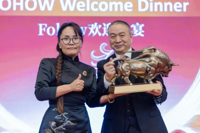 嘉宾们纷纷送上带有民族特色的礼物,蒙古的马头琴、公牛雕塑,俄罗斯传统玩偶,都承载了各国人民对集团的祝福。