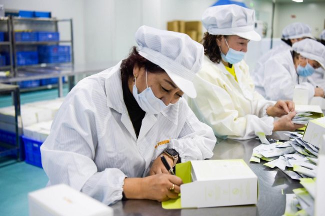 戴上手套,他们将一瓶瓶口服液仔细放入海绵卡槽,盖上盒盖,并放入一张亲笔签名卡。