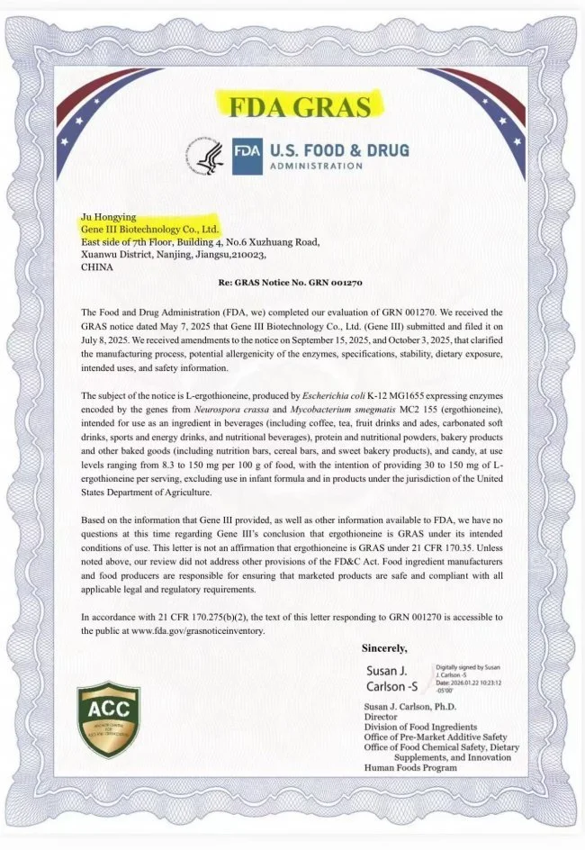 GeneIII仅三麦角硫因获FDA GRAS认证报告实证实图唯一编号严禁盗图